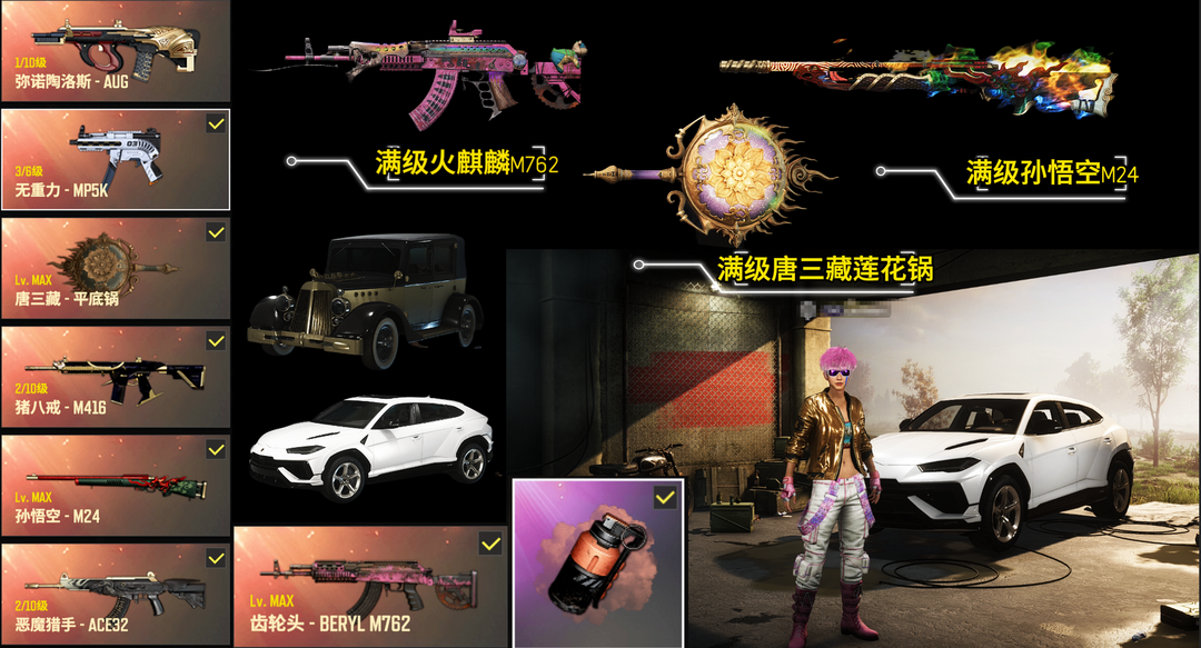 【2满级9神器】保时捷911跑车/满马丁/杜卡迪/迈凯伦/双小丑/满级霓虹AUG/满级唐三藏锅/火麒